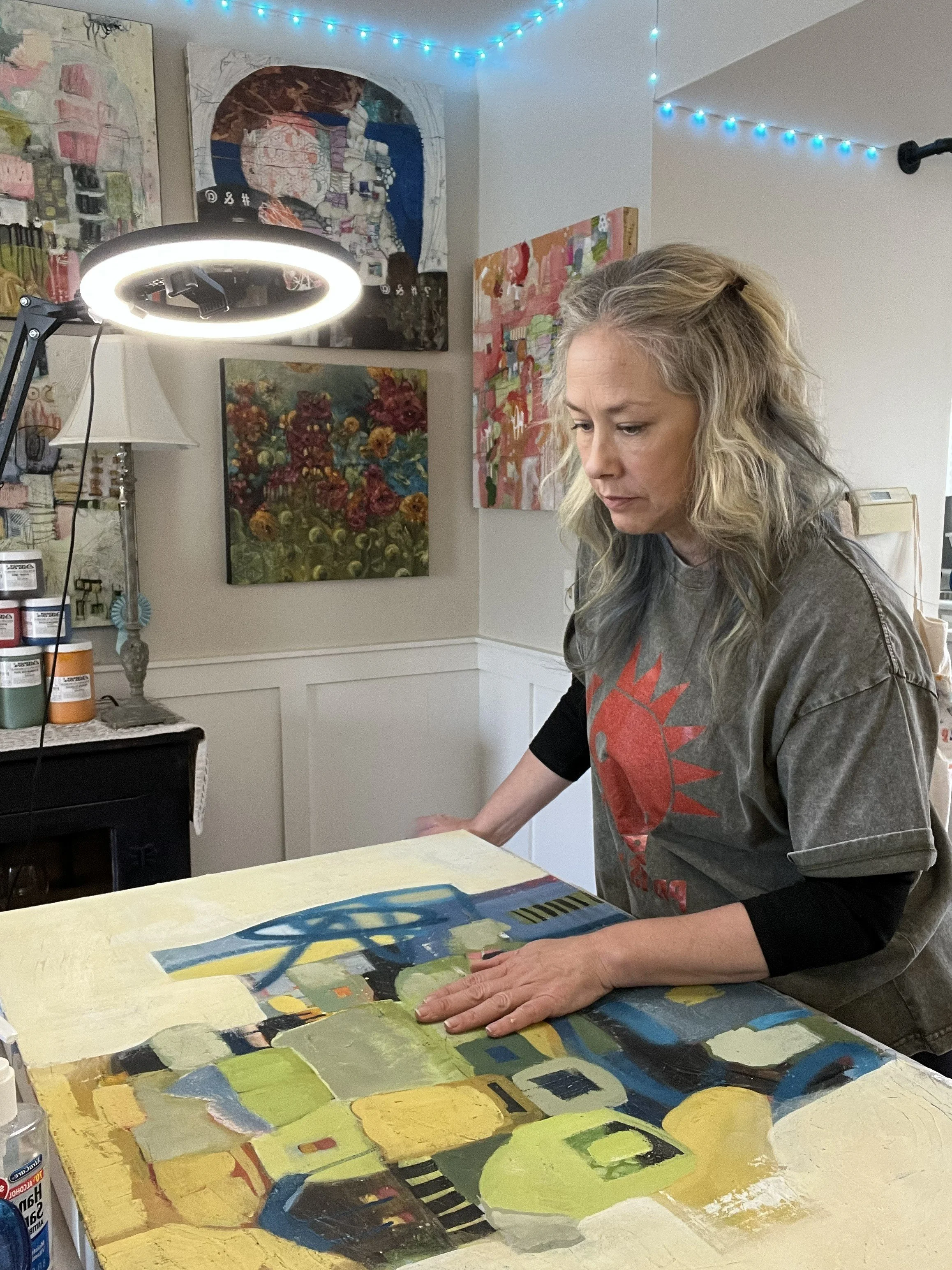 My studio is a home-based workspace where painting unfolds through a disciplined, process-driven practice rooted in intuitive play and material inquiry. Each work begins without a predetermined outcome and develops through layering, revision, and sustained attention to surface, structure, and mark. Working in close proximity to daily life establishes a steady rhythm of focus, allowing intuition to operate within a deliberate and rigorous framework.